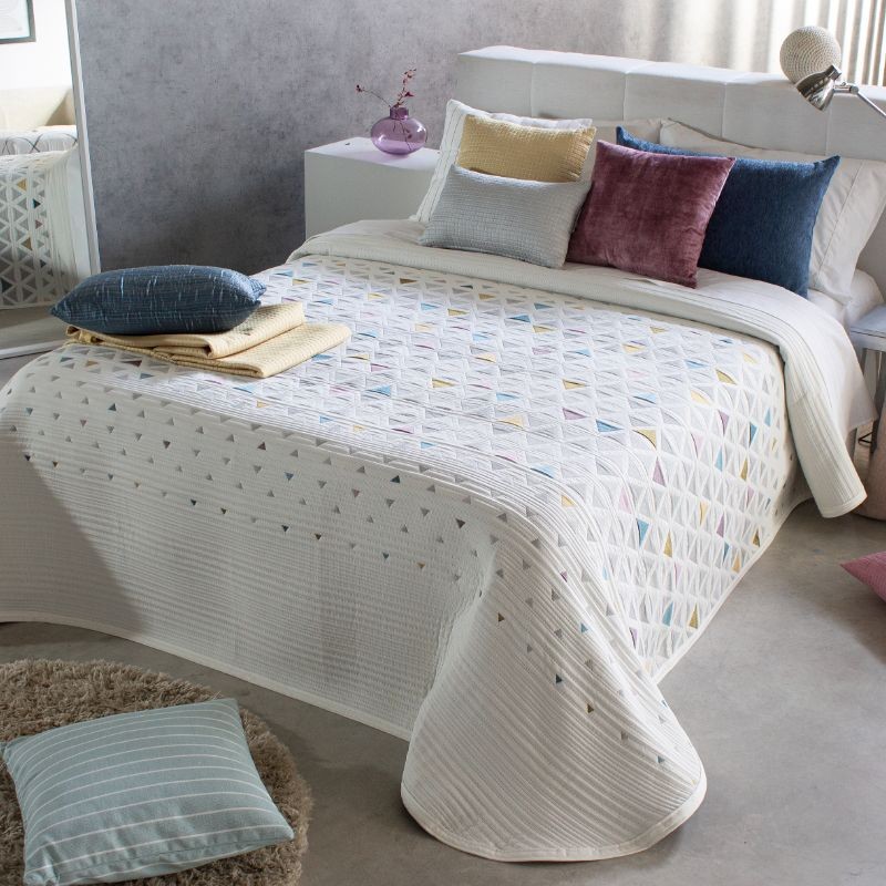 Colcha Reversible Bryton de la marca Reig Marti diseño muy divertido con triángulos en tonos llamativos que cubren la parte superior de la colcha, y con pequeños triángulos en la parte inferior. Esta disponible en color blanco, y al ser reversible, podrás cambiar la decoración del dormitorio fácil y cómodamente cuando quieras.