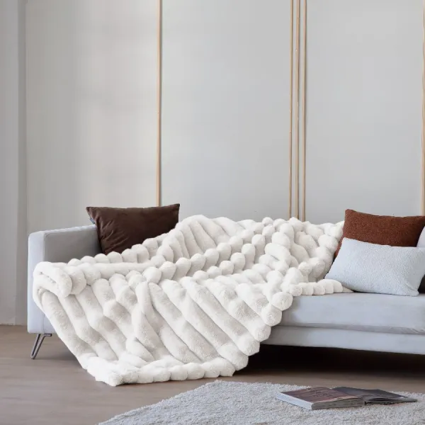 Gracias a su tacto suave y agradable, este plaid es perfecto para usar sobre sofás, sillones o a los pies de la cama, aportando confort y un toque decorativo. Sus tonalidades neutras y frescas permiten crear ambientes luminosos y acogedores durante todo el año.