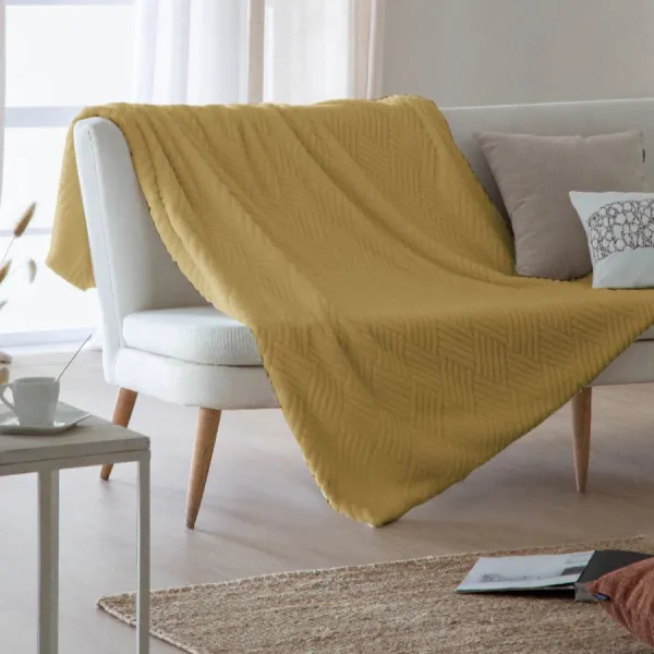 Plaid Dariel de Antilo en colores mostaza, natural y nude. Ideal para decorar dormitorio o salón aportando calidez y estilo.
