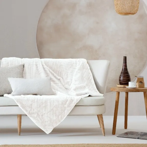 El Plaid Antilo River, confeccionado en 100% poliéster, destaca por su diseño en colores taupe y blanco, acompañado de una textura suave y agradable que lo hace cálido y acogedor. Sus medidas son las siguientes: