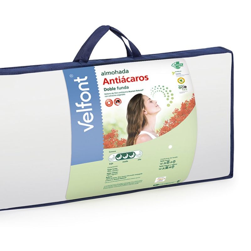 La Almohada Antiácaros Velfont posee un relleno especial para alérgicos, con tratamiento antiácaros Acarsan, que mantiene sus propiedades después del lavado.