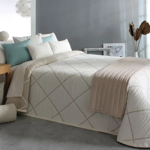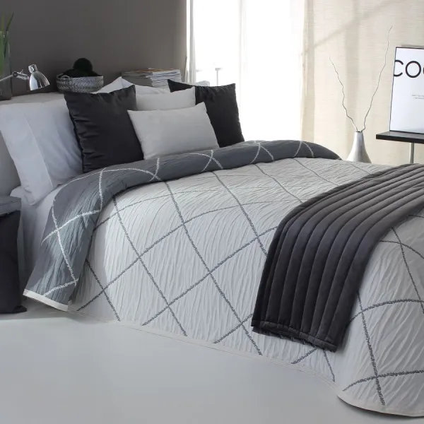 Colcha Reig Marti modelo Damir Colcha de la nueva colección Reig Marti con un diseño geométrico en 2 colores sobre fondo neutro. La colcha está disponible con diseño reversible, ribete y puntas redondeadas.