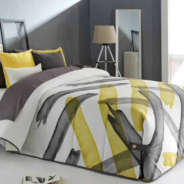 Edredón acolchado Aren Reig Marti ideal para todos los dormitorios con cama de matrimonio o con cama individual ya que está confeccionado en estas tallas. Este edredón cuenta con un estampado abstracto de líneas gruesas en color gris oscuro y verdoso ideal para combinar con resto de decoración de tu dormitorio. Además, puedes combinar con un plaid.