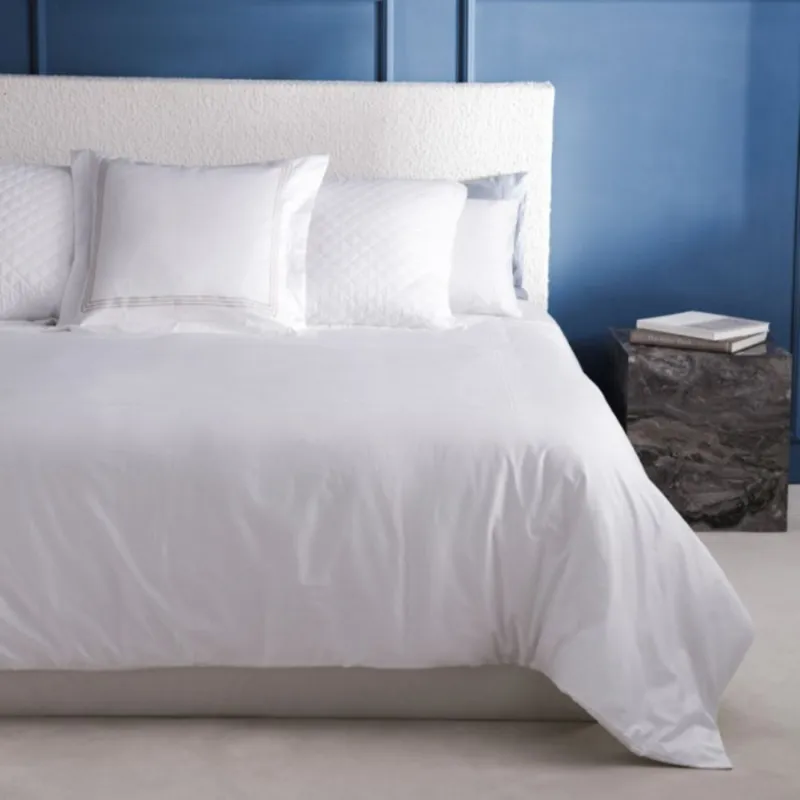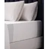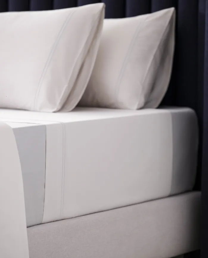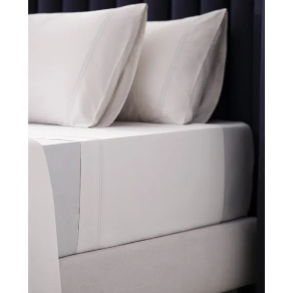 Juego de Sábanas Prince Bassols confeccionado en algodón peinado y mercerizado de fibra larga. Su tejido satén de 400 hilos ofrece un tacto sedoso y fresco, mientras que el doble bordón artesanal realza su diseño sofisticado y atemporal.